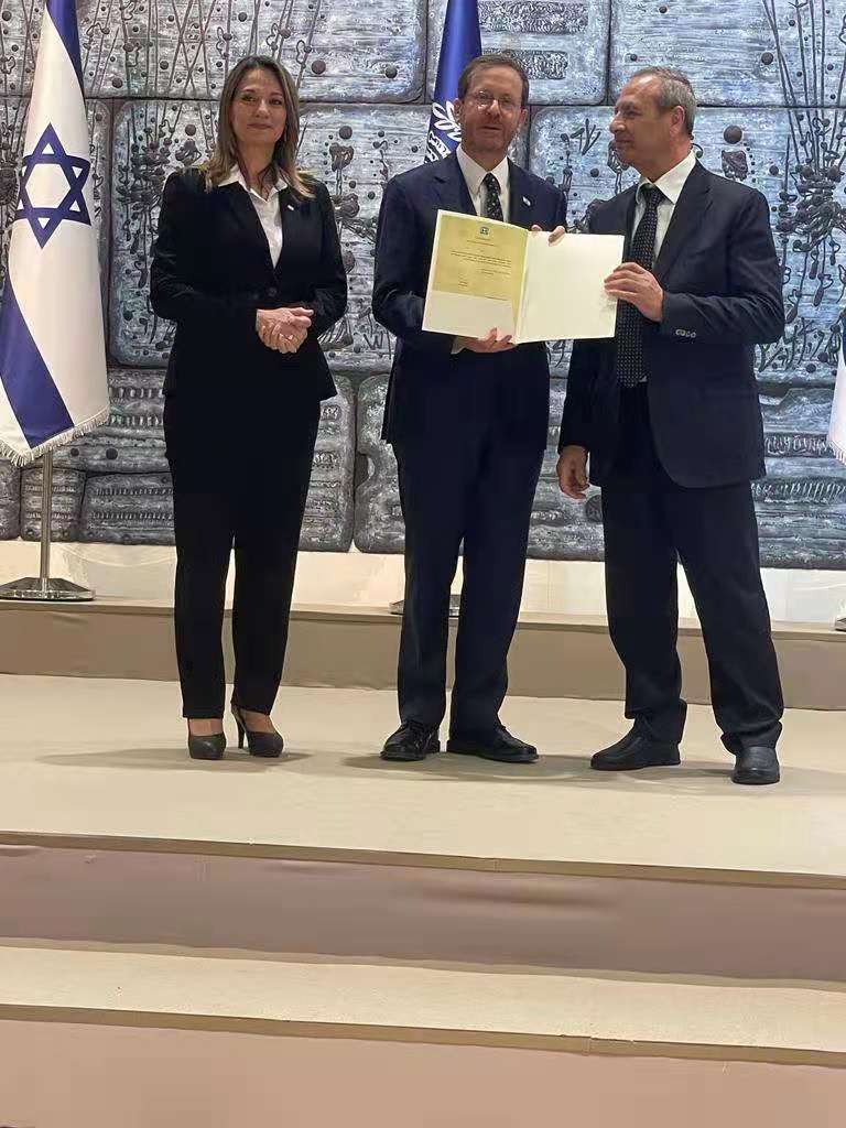 延藜生物首席科學(xué)家Fuad Fares,受聘新一屆以色列高等教育委員會(huì),參加總統(tǒng)主持的典禮,受以色列總統(tǒng)赫爾佐格(中)接見。