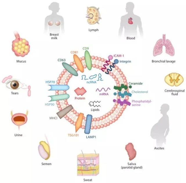 外泌體的發現始于獲得1974年諾貝爾獎的囊泡運轉機制。它廣泛存在于組織間液、體液、血液、尿液、羊水、唾液、腦脊液和母乳等多種體液中。可以包裹攜帶RNA,DNA,蛋白質、短肽、脂質等多種信號分子,其表面膜上還有豐富的抗原表達,是一種新型的細胞間信號傳遞的媒介。并且外泌體中富含生物活性物質,可以在體內“無阻礙通行”,傳遞細胞間信號分子,從而調控許多生理病理過程。
